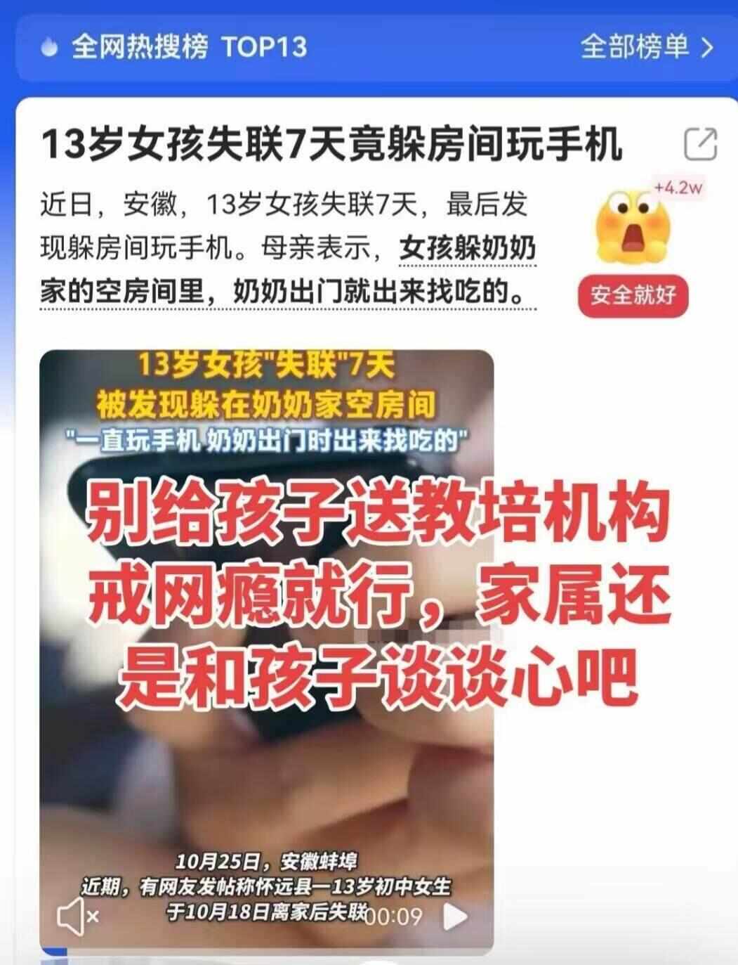 一名13岁女孩7天失联,躲在空房间里沉迷手机。
